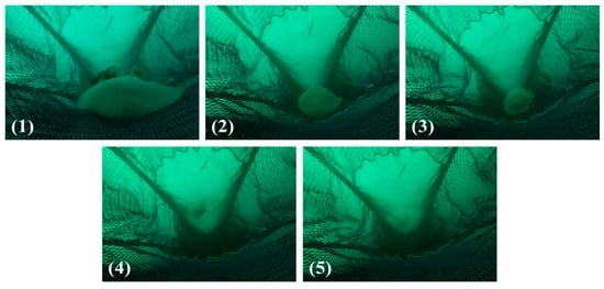 Camera observation analysis revealed that fish entering the gear from below typically passed through the BRD and were captured in the COD, whereas those entering from above bypassed the BRD and escaped. In contrast to the fish, Nomura’s jellyfish frequently collided with the BRD and were deflected upward, escaping through the opening even when they entered from below. Jellyfish that were eventually found in the COD did not pass through the BRD but were trapped in the narrow spaces between the guide and body nets. Many of these jellyfish adhered to the sides of the BRD during towing and subsequently entered the COD during hauling or were torn apart by the guide net and strong currents, with the resulting fragments entering the COD.