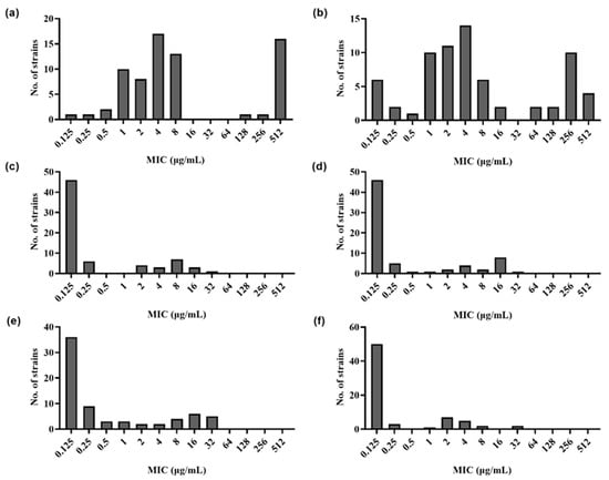 MICs of 70 P. damselae subsp. damselae isolates against (a) nalidixic acid, (b) pipemidic acid, (c) norfloxacin, (d) ciprofloxacin, (e) moxifloxacin, and (f) gatifloxacin.