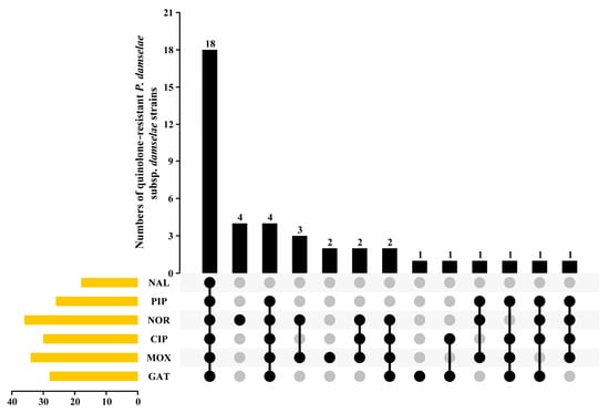 In aquaculture, intensification of existing farming systems delivers both higher production and greater risk of disease outbreaks []. Some emerging bacterial diseases, especially those caused by Vibrio spp., Aeromonas spp. and Pseudomonas spp., have been frequently reported in aquaculture, causing significant economic losses [,,]. In China, the largest aquaculture production is accompanied by a large amount of antibiotic consumption []. Quinolones are synthetic antimicrobial agents that are widely used in aquaculture for the prevention and treatment of bacterial infections [,]. However, misuse of these antibiotics usually happens in some aquaculture systems due to high stocking densities and poor culture management and conditions [,]. Moreover, oral administration, as the main drug administration route in aquaculture, has many drawbacks such as the inability to precisely control the dosage, poor absorption, and easy spread into the environment, which will increase the antibiotic resistance in bacteria accumulated in cultured animals and environments around farms, and decrease the efficiency of the antibiotics and exacerbate their misuse [,]. Quinolone resistance has been reported in several aquatic pathogens including Aeromonas spp. [] and Vibrio spp. [,]. Moreover, quinolone resistance genes have been reported in P. damselae subsp. piscicida strains []; however, this has not been studied in P. damselae subsp. damselae.