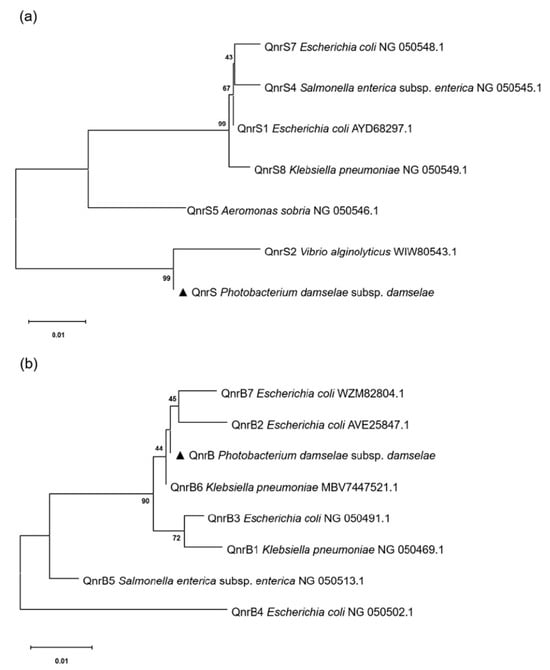 Phylogenetic tree of QnrS (a) and QnrB (b) proteins. QnrS and QnrB of P. damselae subsp. damselae detected in the present study were marked by triangles. The rooted trees were constructed via the neighbor-joining method and bootstrapped 1000 times using MEGA 8.0 software.