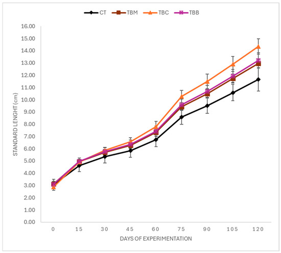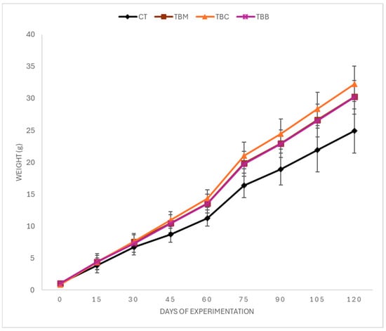 Regarding growth in length and weight, the organisms that obtained the highest values in terms of standard length (Figure 1) were from the TBC treatment, followed by the tilapia from the TBB and TBM treatments, with a significant difference between the TBC and CT treatments (p < 0.05). The trend of the results was similar with respect to fish weight (Figure 2), where the organisms that obtained the highest values were from the TBC treatment, followed by TBB and TBM. At the end of the experimentation, the ANOVA test showed significant differences between TBC and CT (p < 0.05).