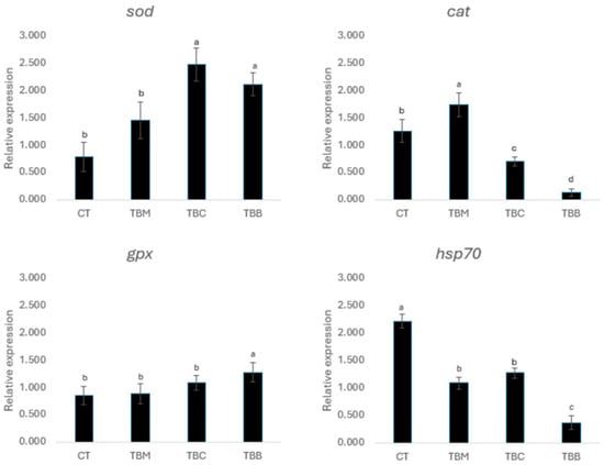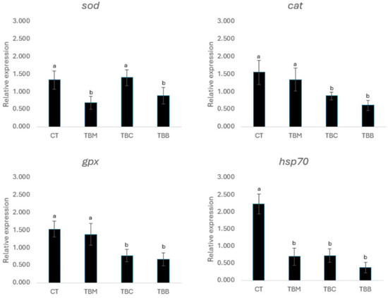Regarding sod expression at 120 days of culture (Figure 3), CT and TBC treatments presented the highest expression levels with significant differences (p < 0.056) in comparison with TBM and TBB. In cat expression, the CT and TBM treatments had the highest expression levels with regards to TBC and TBB, also with significant differences (p < 0.05). A similar trend was observed in gpx expression, where the TBC and TBB treatments showed a decrease in expression with respect to CT and TBM (p < 0.05). Finally, biofloc treatments had a significantly lower expression level in the hsp70 gene in comparison to CT (p < 0.05) (Figure 3).