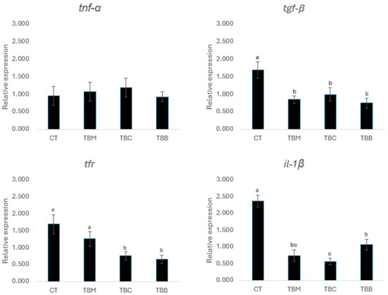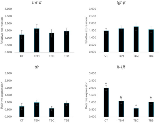 However, in relation to the tfr gene, the TBC and TBB treatments showed significant differences with respect to the CT and TBM treatments (p < 0.05), with a reduction in expression levels with respect to CT. Finally, the il-1β gene showed a reduction in expression levels in biofloc treatments in comparison with CT (p < 0.05) (Figure 4).