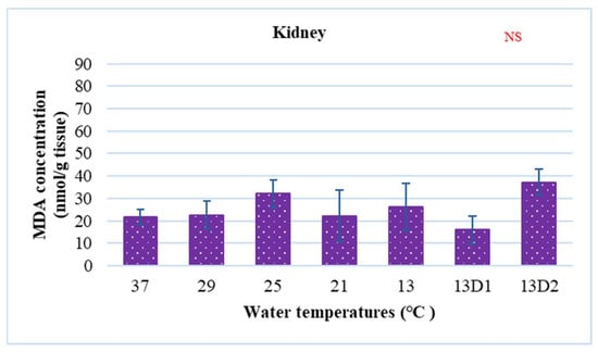 MDA is the secondary product of the lipid peroxidation process and the kidney is the organ with the smallest amount of lipids, leading to low rates of MDA in this organ. Furthermore, changes in external temperatures did not affect changes in kidney function [12]. Accordingly, MDA concentrations in the kidneys were found to be very low under both normal and stress conditions. On the other hand, the gills are the organ that is in direct contact with the water; as such, any hazard in the water will exert an influence on this organ. Our investigation revealed that the amount of MDA was very high at 13 °C when the fish were incubated for 24 h, but then decreased the next day. The results of this experiment are consistent with those of the study by Phrompanya et al. [33], who predicted that MDA concentrations in the gills increased at 13 °C and gradually decreased after that. In addition, they found that rapid temperature changes can induce severe histological damage in gills of O. niloticus, destroying their lamellar epitheliums, causing the formation of aneurisms, and affecting defense mechanisms through the decrease in mucous cells.