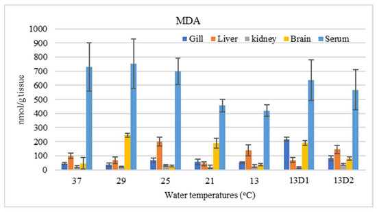 In the context of inducing cold shock, a significant decrease in serum MDA levels was observed in both the 21 °C and 13 °C groups, compared to the control group maintained at 25 °C. However, when the temperature was sustained at 13 °C for periods of 24 h and 48 h, increases in serum MDA levels were noted (Figure 2). The MDA level in the brain of the control group was lowest. The findings indicated that MDA levels in the brain exhibited fluctuations across each group. Specifically, the MDA levels were elevated at temperatures of 29 °C, 21 °C, and 13 °C (D1) (p < 0.05) (Figure 3). Similarly, the MDA concentrations in the liver also fluctuated; however, they demonstrated an inverse trend compared to those in the brain. At 25 °C, the liver exhibited a notably high MDA concentration, though it did not reach the levels observed in serum, measuring 200 nmol/g tissue (Figure 4). In the gills, the increase in MDA content occurred when they were incubated at 13 °C for 24 h (13D1), but it was abated when the temperature was at 13 °C for 48 h (13D2) (Figure 5). In terms of kidney MDA levels, only one level of MDA content in this source was not significantly different after subjected to heat and cold shocks (Figure 6). However, upon comparing MDA levels from various sources, it is evident that the concentration in serum is significantly higher than in other sources, such as the brain, liver, gills, and kidneys (Figure 7).