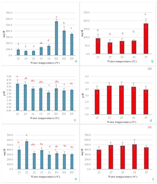 Serum glucose levels began to change when the temperature was reduced to 17 °C. Subsequently, a significant increase was observed as the water temperature decreased to 13 °C, with a further rise noted when this temperature was maintained for an additional 24 h. However, after being sustained for 48 and 72 h, serum glucose levels decreased steadily and noticeably (Figure 9a). In the heat shock experiment, it was found that serum glucose levels did not change after the water temperature increased to 33 °C. However, when the temperature was raised further to 37 °C, glucose levels approximately doubled (Figure 9b). For serum total protein, significant changes were observed only during the cold shock experiment. The total protein levels tended to decrease as the water temperature was lowered, reaching their minimum value when the temperature dropped to 13 °C. The heat shock experiment showed that it did not have a statistically significant effect on total protein levels (Figure 9c,d). Serum cholesterol exhibited a response similar to that of total protein, showing significant changes only in the cold shock experiment. In contrast, no statistically significant changes were observed in the heat shock experiment. During the cold shock experiment, the changes in serum cholesterol did not follow a clear pattern. Cholesterol levels increased significantly with the initial rapid drop in temperature but subsequently decreased as the temperature continued to decline, reaching their lowest point at 13 °C. However, when the temperature was maintained at 13 °C for 24, 48, and 72 h, cholesterol levels showed a slight upward trend (Figure 9e,f).
