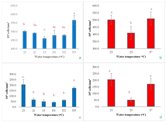 The impact of water temperature variations on the levels of total red blood cells (a,b) and white blood cells (c,d) in Barbonymus gonionotus was analyzed through (blue color) cold shock and (red color) heat shock experiments. The results are presented as mean ± standard deviation (SD). Different lowercase letters above the bars indicate statistically significant differences (p < 0.05) among distinct temperature conditions, as determined by one-way ANOVA followed by a post hoc Tukey’s test.