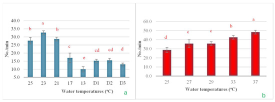 The impact of water temperature variations on the levels of operculum movement in Barbonymus gonionotus was analyzed through (a) cold shock and (b) heat shock experiments. The results are presented as mean ± standard deviation (SD). Different lowercase letters above the bars indicate statistically significant differences (p < 0.05) among distinct temperature conditions, as determined by one-way ANOVA followed by a post hoc Tukey’s test.