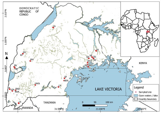 The study was conducted in the lakes: Victoria Basin and Albertine Drainage Basins. These are among the most active areas for C. gariepinus aquaculture production in Uganda [8,12].