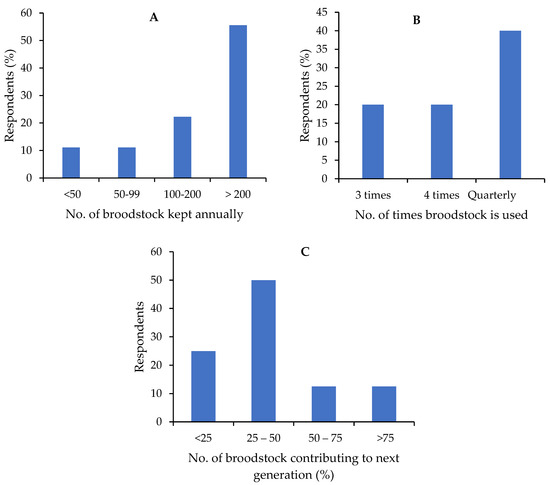Broodstock evaluation (N = 24). (A) Number of broodstock kept annually, (B) frequency of broodstock use, (C) broodstock contributing to the next generation.
