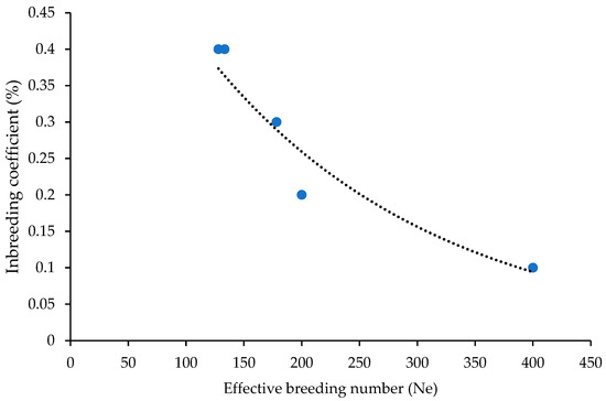 The average breeding coefficient (F) was inversely proportional to the effective breeding number (Ne) (Figure 5). The lowest average breeding coefficient (F = 0.1%) was observed with an effective breeding number of 400 at a 1:1 mating ratio, followed by 200 (F = 0.2%). The highest inbreeding coefficient (F = 0.4%) was recorded for effective breeding numbers of 133 and 128, with mating ratios of 1:3 and 1:2, respectively (Table 1).