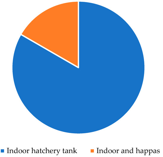 The current study indicates that most farmers utilize indoor tanks to raise their fingerlings, a beneficial practice as it provides a controlled environment for production. One previous study emphasized the benefits of indoor tanks in aquaculture, as they facilitate easier monitoring and management of environmental factors [49]. This study noted that indoor tank systems enable farmers to maintain optimal water quality, essential for the growth and health of fingerlings. This is in line with the findings of the current study, where the controlled environment in indoor tanks is recognized as advantageous for production. Regulating factors such as oxygen levels, pH, and temperature results in a more stable and predictable rearing environment, particularly vital during the early life stages when fingerlings are particularly susceptible to environmental stressors.