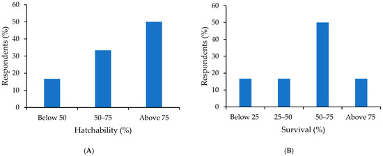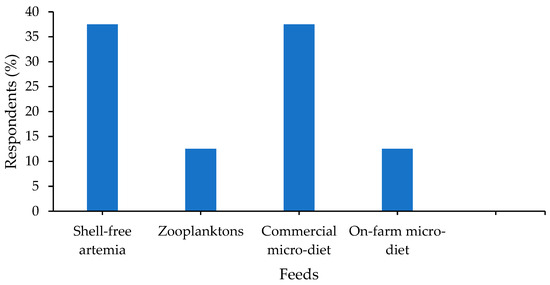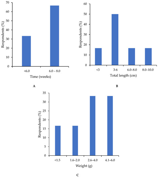 Many studies report that the weight of standard fingerlings ranges from 5 to 10 g [39,57,58], which aligns with the current findings. Most respondents indicated that it takes an average of seven weeks to raise 5.0 g fingerlings using commercial micro diets and shell-free Artemia. The introduction of shell-free Artemia and cost-effective commercial micro diets has resolved the persistent challenges associated with feed nutrition [59].