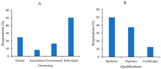 Farm ownership and academic qualifications (N = 24). (A) Ownership, (B) educational level.