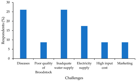 Fish hatchery operators were queried about the main challenges hindering their farm production. Diseases and an inadequate water supply were the major challenges, followed by the electricity supply (17%) (Figure 12). Interestingly, only 8% of fish hatchery operators identified broodstock quality as their primary challenge (Figure 12).
