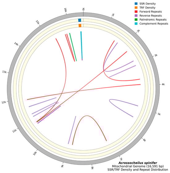 The mitochondrial genome of A. spinifer was systematically analyzed for the presence and distribution of different types of repetitive elements, including microsatellites (simple sequence repeats or SSRs), tandem repeats, and dispersed repeats, all of which contribute to genomic complexity and may influence mitochondrial function and evolution [,,].