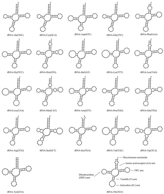 All 22 tRNA genes could be folded into the typical cloverleaf secondary structure, except for tRNASer (GCU), which lacked the dihydrouridine (DHU) arm (Figure 4). The predicted secondary structures showed features commonly observed in vertebrate mitochondrial tRNAs. The acceptor arms of all tRNAs were 7 bp in length and the anticodon arms were 5 bp long with an anticodon loop of 7 nucleotides. The D-loops ranged from 4 to 8 nucleotides, while the variable loops contained 4–5 nucleotides. The TΨC arms were typically 5 bp in length with TΨC loops of 3–7 nucleotides. Several non-canonical base pairs were observed in the stems of various tRNAs, including G-U wobble pairs and other mismatches. The presence of the mismatched base pairs seen in tRNA sequences may be corrected by the RNA-editing process, which has been extensively studied in vertebrate mitogenomes []. Overall, the secondary structure of the tRNA in A. spinifer exhibited the normal Watson–Crick pairing seen in vertebrate mitogenomes [].