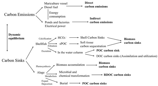 Current research on marine carbon sinks and emissions primarily focuses on two dimensions. The first dimension emphasizes single-aspect quantitative analyses, examining either carbon sinks or carbon emissions in isolation. Among them, regarding carbon sinks, scholars typically quantify the carbon sink capacity of specific marine organisms or ecosystem components while assessing their environmental or socioeconomic impacts [14]. For instance, Luo et al. [15] evaluated the carbon sink function of global cultivated seaweeds from 2000 to 2009, revealing an annual carbon removal of approximately 4.48 × 107 tons, with RDOC playing a critical role in seaweed-based carbon sinks. Similarly, Liu et al. [16] proposed an integrated marine carbon sink assessment framework and accounting methodology by incorporating shellfish and algae aquaculture, coastal wetlands, and nearshore carbon sinks, with the total ocean carbon sink in China estimated at 69.83–106.46 Tg C/year, of which the mariculture carbon sink accounted for 2.27–4.06 Tg C/year. In studies addressing carbon emissions, research prioritizes carbon footprint assessments of energy-intensive processes (e.g., energy consumption, feed production) within marine economic activities. These studies provide data-driven insights for enhancing carbon sink efficiency or reducing emissions through single-dimensional quantification. However, their limitations lie in the lack of holistic analysis, failing to elucidate the dynamic equilibrium between carbon sequestration and emissions.