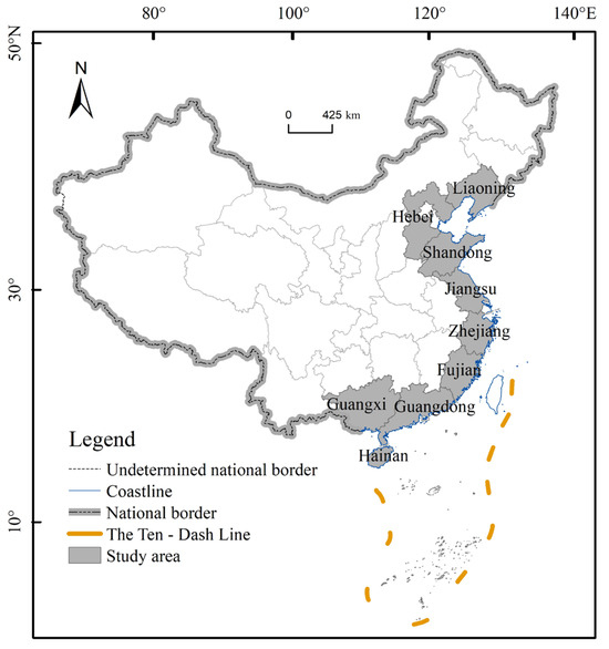 - Jia, D.; Liu, X.; Guan, X.; Guo, J.; Zhang, S.; Li, H.; Jin, Y.; Jun, S. Spatio-temporal differences and simulation studies of the carbon budget from fisheries in the northern marine economic circle of China. Front. Mar. Sci. 2024, 11, 1393659. [Google Scholar] [CrossRef]
