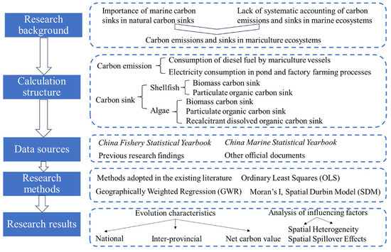 This paper first organizes and accounts for the specifics of mariculture carbon emissions and carbon sinks. Secondly, the spatial–temporal evolution of carbon emissions, carbon sinks, and net carbon values is analyzed. Finally, ordinary least squares linear regression and geographically weighted regression are used to analyze the influencing factors of carbon emissions and sinks. The spatial spillover effects are further analyzed by using Moran’s I and the spatial Durbin model. The specific research framework diagram is shown in Figure 3.