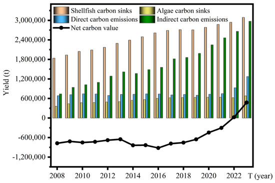Figure 4 comprehensively illustrates the dynamic characteristics of carbon emissions, carbon sinks from shellfish and algae, and net carbon values in China’s mariculture from 2008 to 2023. Temporally, total direct and indirect carbon emissions showed continuous growth, which is consistent with the findings of Li et al. [17] and Wu and Li [29]. This indicates that with the expansion of the scale of the mariculture industry and the increase in production intensity, the demand for diesel and electricity grows synchronously. Among them, the direct emissions were relatively stable, likely due to improved diesel efficiency in fishing vessels through fuel optimization and energy-saving technologies. However, indirect emissions grew rapidly, closely linked to the expansion of pond and industrialized aquaculture, heightened electricity dependency per unit output, and insufficient application of clean energy sources.