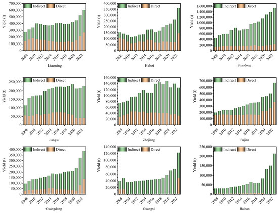 Figure 5 illustrates the spatiotemporal evolution of direct and indirect carbon emissions from China’s mariculture between 2008 and 2023. Over the 16-year period, both emission types have shown a sustained upward trend, with indirect carbon emissions increasing at a significantly faster rate than direct ones. This divergence highlights the growing influence of electrification and intensive farming models on emission dynamics.