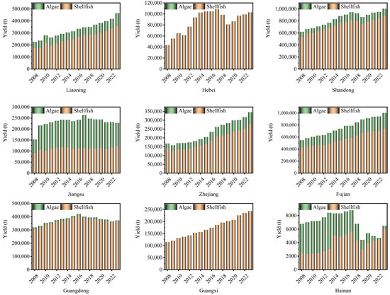 China’s coastal areas, with their long coastlines and vast sea areas, provide unique natural conditions for the development of the mariculture industry. Among them, Liaoning, Hebei, Shandong, Jiangsu, Zhejiang, Fujian, Guangdong, Guangxi, and Hainan together constitute the core area of mariculture in China (Figure 2). As shown in Table 1, in terms of the time scale, from 2008 to 2015, the area of mariculture showed a trend of relatively steady growth, while from 2016 to 2019, it basically showed a slow decrease. As of 2023, the area of coastal mariculture in China reached 2,213,931 ha, a year-on-year increase of about 6.78%. In terms of spatial changes, from the development in 2008 to 2023, the area of mariculture in six places, namely Liaoning, Shandong, Jiangsu, Fujian, Guangxi, and Hainan, increased, which was mainly due to policy support, abundant sea resources, and leading aquaculture technology, while Hebei, Zhejiang, and Guangdong showed a decreasing trend, which was mainly due to industrial structural adjustment, strengthened ecological protection, and market factors. Overall, the development of mariculture in China is relatively stable and occupies a significant position in the economic structure.