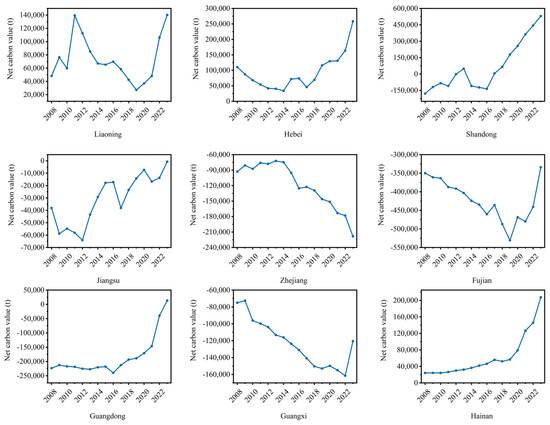 Figure 7 illustrates the spatiotemporal trends in the net carbon value (i.e., emissions minus sinks) from mariculture in nine coastal provinces between 2008 and 2023. The analysis reveals distinct provincial trajectories in achieving carbon neutrality in mariculture. Provinces such as Liaoning, Hebei, Shandong, and Hainan generally exhibit positive net carbon values, meaning that their carbon emissions exceed carbon sinks. In Liaoning and Hebei, this is largely attributed to the dominance of diesel-powered vessels and outdated aquaculture systems, as well as the limited penetration of clean energy technologies. Particularly in Hebei, the high net carbon value is due not only to low carbon sink capacity, but also to the province’s heavily industrialized aquaculture setup, which relies on fossil fuel-driven equipment and non-optimized infrastructure. The combination of low carbon sequestration potential and high energy intensity makes Hebei’s aquaculture sector one of the most environmentally inefficient in the coastal region.