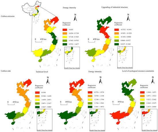 Carbon emissions and sinks from mariculture in China are influenced by a variety of factors and show obvious spatial differences in different regions (Figure 8). Among them, energy intensity and industrial structure upgrading have important effects on carbon emissions. From the spatial distribution of the regression coefficients, energy intensity has a significant positive effect on carbon emissions, especially in Jiangsu and Zhejiang, where the regression coefficient is as high as 1.668, which reflects the strong coupling relationship between energy consumption and carbon emission costs. It also indicates that mariculture enterprises are more inclined to exchange energy inputs for output growth, especially in pond farming and factory-long aquaculture, where the lack of green energy substitution technology leads to high energy consumption and carbon emissions per unit of output value. At the same time, in terms of fishing vessel operations, small fishing vessels have been upgraded to larger sizes to increase production capacity, and this pursuit of “economies of scale” does improve productivity in the short term, but ignores the increase in marginal carbon costs due to the increase in engine power. Thus, the current increase in energy intensity has not yet led to improvements in energy efficiency through technological advances, but rather to capacity expansion at the expense of increased energy consumption.