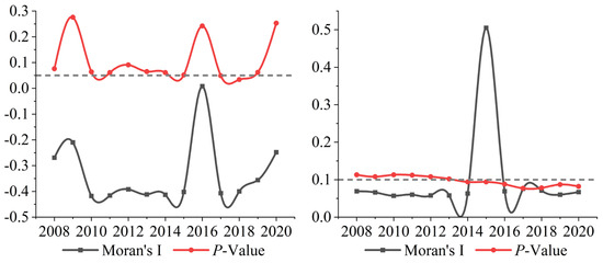 Figure 9 depicts the autocorrelation coefficients of carbon emissions and carbon sinks, respectively. It can be seen that from 2008 to 2020, most of the Moran indexes of carbon emissions were negative and basically passed the significance level test of 0.05; and most of the Moran indexes of carbon sinks were positive and basically passed the significance level test of 0.1. This indicates that carbon emissions have a negative spatial correlation among coastal provinces, while carbon sinks have a positive spatial correlation.