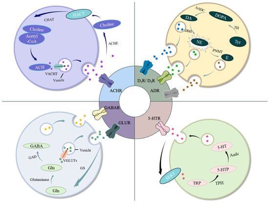 Glu and GABA are the principal neurotransmitters in the central nervous system. Both Glu and GABA are synthesized not only in the brain, but also in peripheral tissues and organs [,]. Glu primarily functions as an excitatory neurotransmitter, while GABA serves as an inhibitory neurotransmitter. These two substances exhibit opposing yet complementary physiological roles, collectively regulating the normal functioning of the nervous system []. Glutamate is synthesized in neurons from intermediates of the glucose-derived tricarboxylic acid cycle and branched-chain amino acids, a process catalyzed by glutaminase using glutamine (Gln) as a precursor. Within neurons, cytoplasmic glutamate is encapsulated into vesicles by vesicular glutamate transporters for subsequent extracellular release. Upon neuronal depolarization and the initiation of signal transduction, these glutamate-containing vesicles are released into the synaptic cleft, where they bind to three types of ionotropic glutamate receptors (iGluRs): N-methyl-D-aspartic acid receptor (NMDA), α-amino-3-hydroxy-5-methyl-4-isoxazole-propionic acid receptor (AMPA), and kainate receptors [], as well as metabotropic glutamate receptors (mGluRs). Subsequently, glutamate is removed and converted into Gln through the action of glutamine synthetase []. The synthesis of GABA is facilitated by the enzymatic action of glutamic acid decarboxylase (GAD), which catalyzes the α-decarboxylation reaction using Glu as a precursor. GABA exerts its effects through GABAA and GABAB receptors, which are classified into two primary categories: ionotropic receptors and metabotropic receptors, respectively [].