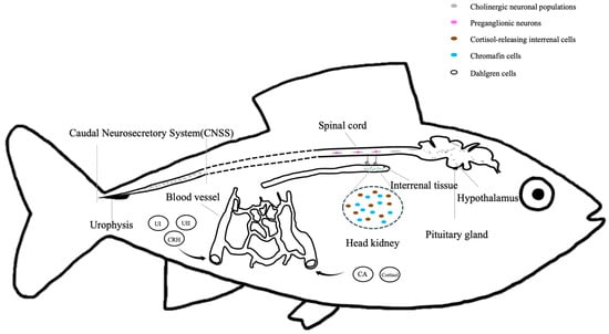 When fish are exposed to stress, the primary stress responses involve neural and neuroendocrine reactions. A perceived threat activates the neural circuits in the brain, which subsequently triggers the downstream endocrine systems and other responsive organs [,]. The nervous system employs a variety of neurotransmitters in response to stress (Figure 1). In fish, three major neuroendocrine systems are involved in stress responses: the brain–sympathetic–chromaffin cell (BSC) axis, the hypothalamus–pituitary–interrenal (HPI) axis, and the caudal neurosecretory system (CNSS), each playing distinct roles in stress adaptation (Figure 2). Specifically, the BSC axis rapidly mobilizes energy and enhances cardiovascular function during acute stress through catecholamine release. The HPI axis orchestrates long-term stress adaptation by regulating metabolism, immunity, and osmoregulation via glucocorticoid secretion. Additionally, the CNSS provides complementary regulation by modulating circulating levels of stress-related hormones and cortisol production in response to specific stressors (Table 2).