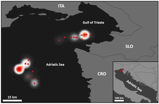 Knowing what a predator preys on can provide information about its habitat preference, distribution and its position in the food web. However, to date the feeding ecology of rays deserved only scarce scientific attention, since only about 30% of the diets of extant rays are known [17]. Despite its widespread distribution, the research on the trophic ecology of common eagle rays in the Mediterranean Sea is still scarce; only few studies were performed recently [18,19,20,21,22,23]. The ecological role and potential impacts of rays in this area, and in the adjacent northern Adriatic Sea, remain unknown. There is scarce information about the diet of rays in the Gulf of Trieste [24,25]. Moreover, no prior published information on the diet composition of the myliobatids from Slovenian waters, the broader Gulf of Trieste or the northern Adriatic in general is currently available. According to its regular presence in the area, the common eagle ray is supposed to play a relevant role in the trophic web.