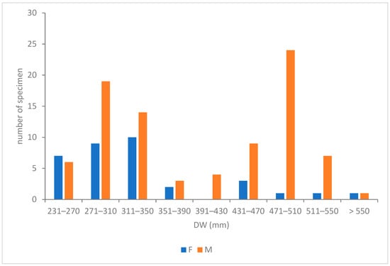 Altogether 122 specimens of M. aquila were measured, weighed and analysed. Eighty-seven (87) of them were males and 34 were females, while in one juvenile specimen we were not able to identify the gender. Males ranged from 232 to 620 mm in DW and weighed from 144 g to 2960 g. Females measured from 238 to 775 mm in DW and weighed from 180 g to 6460 g. Males and females showed significantly different lengths (Kruskal–Wallis’s test p value = 0.024; α = 0.05) and weight (Kruskal–Wallis p value = 0.0167; α = 0.05). On average, males were bigger (399.8 mm versus 340.4 mm) and heavier than females (1245 g vs. 771 g). If we consider the size at maturity which is from 360–410 mm DW for males and 480–580 mm DW for females, then the studied samples consist of juvenile and adult males and juvenile and adult females (Figure 2). The length (TL)—weight (W) relationship was statistically significant for both sexes considering the exponential functional relation and the 0.05 alpha level (males; y = 31.196e(0.0084x), R2 = 0.96; females, y = 46.767e(0.007x), R2 = 0.99).