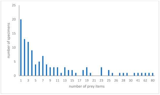 From a total of 122 stomachs of the common eagle ray examined, 113 contained food, while 9 (7.38%; 5 females and 4 males) were empty. Altogether 1152 prey items were obtained from the stomachs. The number of prey items per stomach varied from 1 to 80 specimens, on average 9.44 ± 4.26 prey items per stomach (Figure 3). Although the mean number of prey items per stomach was nearly 10, more than 29% of full stomachs with food contained only one or two prey items. Most commonly one prey specimen was found in the stomachs (16.4% of studied specimens).