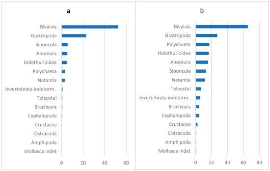 Figure 4. Relative abundance (a) and frequency of occurrence (b) of higher taxa in the diet of Myliobatis aquila in the northern Adriatic Sea.