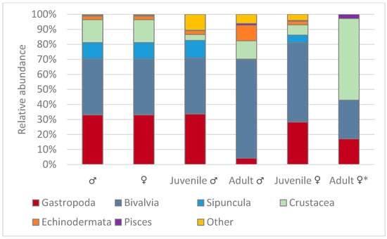 Figure 5. Relative abundance of higher taxa in the diet of male and female specimens of the common eagle ray Myliobatis aquila in the northern Adriatic Sea regarding size class (juvenile, adult); * small sample size.