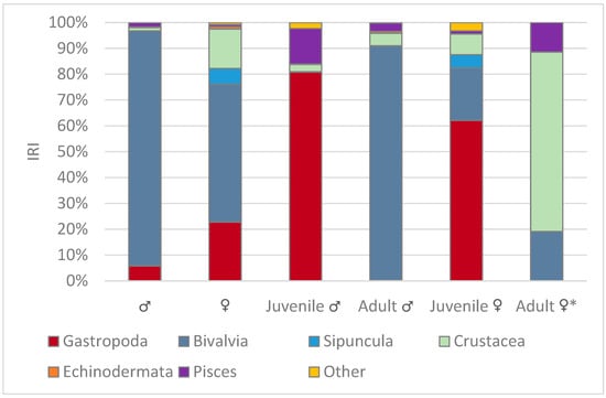 From the perspective of relative importance (IRI%), the percentage of bivalves was considerably greater in males (Figure 6). However, more prey categories (in term of IRI values) were preyed by females, thus indicating a more diverse diet. For males, the shift in prey importance from gastropods in the juvenile phase, to bivalves in the adult phase, was observed and was, comparing to relative abundance, even more pronounced. A similar dietary trend was detected for females as well (having in mind that we obtained only three adult females); in the juvenile phase gastropods were the dominant taxonomic group, which were, in the adult phase, substituted by prey groups crustaceans and fishes.