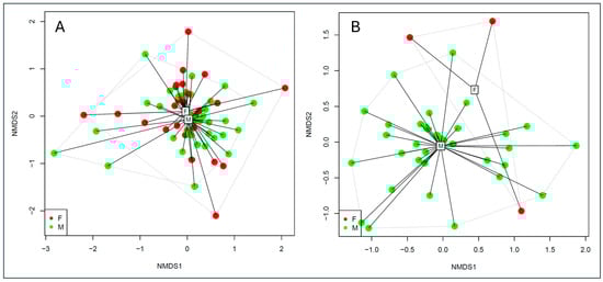 Figure 7. Similarities/differences in prey composition in the diet of male and female specimens of the common eagle ray Myliobatis aquila from the northern Adriatic Sea regarding juvenile (A) and adult (B) size classes in the NMDS space.