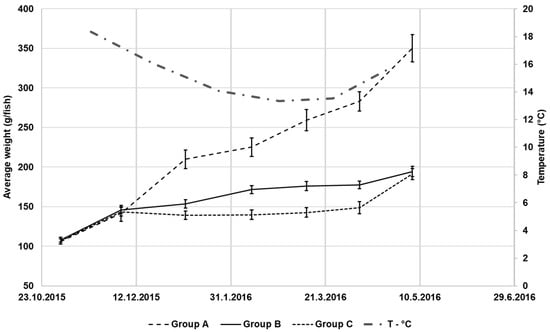 Average body weight (g/fish) of meagre in experimental groups A (sardine diet), B (commercial pellets), and C (moisturized pellets) from October 2015 to June 2016. The dashed–dotted line indicates the average seawater temperature (°C). Note the divergence in growth between group A and groups B/C as temperatures dropped below 18 °C. Data are presented as means ± SE.