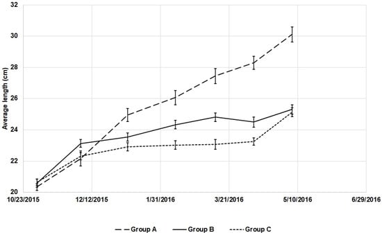 Average length (cm) of meagre in experimental groups A (sardine diet), B (commercial pellets), and C (moisturized pellets) from October 2015 to June 2016. Similar to weight gain (Figure 1), group A shows a continued increase in length, while growth in groups B and C appears to slow down during colder periods. Data are presented as means ± SE.