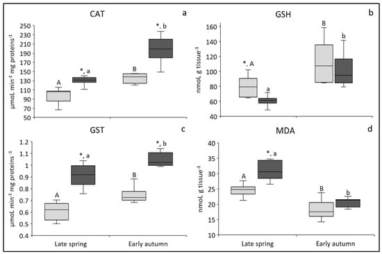 3.2. Changes in Biomarkers of Antioxidative Capacity (CAT, GSH), Xenobiotic Detoxification (GST), and Oxidative Damage (MDA)