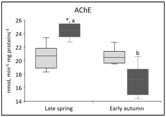 3.3. Changes in Biomarker of Neurotoxicity (AChE)