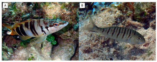 Representative images of the sampled fish: (A) the painted comber Serranus scriba; (B) the striped seabream Lithognathus mormyrus.