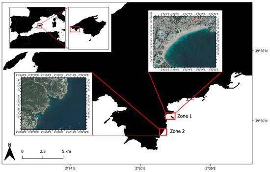 Map of the sampled zones: Zone 1 (Magaluf Beach) and Zone 2 (between Cala Bella Dona and Cala Falcó). The map was created using the open-source Quantum Geographic System (QGIS) version 3.40.6 (Bratislava, Slovakia). Satellite images for each zone are included, with corresponding coordinates shown along the axes.