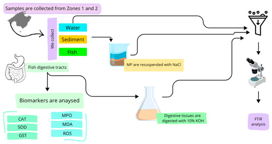 Flowchart of the sample processing procedure, including both microplastic identification and biomarker analysis steps. CAT (Catalase), SOD (Superoxide dismutase), GST (Glutathione s-transferase), MPO (Myeloperoxidase), MDA (Malondialdehyde), ROS (Reactive oxygen species), FTIR (Fourier Transform Infrared Spectroscopy).