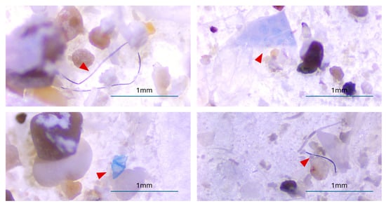 Representative images of the MP(Microplastic) found in both digestive tracts of S. scriba and L. mormyrus. Scale bar = 1 mm. Red arrows indicate the identified MP particles.