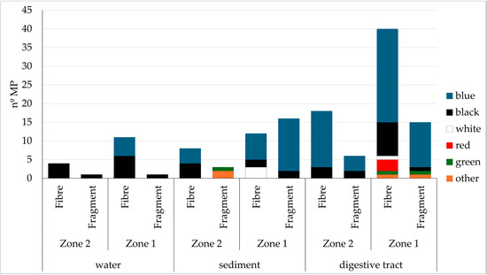Characterization of microplastics (shape and colour) found in water, sediment and digestive tracts for Zone 1 and Zone 2. Colours represent different microplastic types.