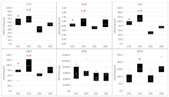 Boxplot graph showing biomarker activity (CAT, SOD, GST, MPO, ROS and MDA) comparing L. mormyrus and S. scriba in Zone 1 (Z1L and Z1S, respectively) and in Zone 2 (Z2L and Z2S, respectively). Statistical significance is represented with ‘*’ to indicate significant differences between zones (Zone 1 vs. Zone 2) within the same species, and with ‘#’ to indicate significant differences between species (S. scriba vs. L. mormyrus) within the same zone.