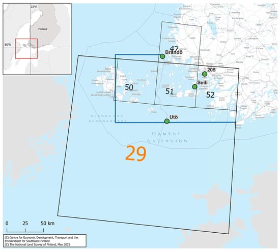 Map of the Archipelago Sea and the locations of water quality monitoring stations. The blue line indicates the boundary of the Archipelago Sea. Water quality observation stations are marked on the map with green circles and labeled. Square 29 is a statistical unit defined by ICES, and within it, the smaller squares 50, 51, and 52 are national units. Subsquare 47 belongs to ICES square 30, but for the purposes of this context, it is considered part of the Archipelago Sea.